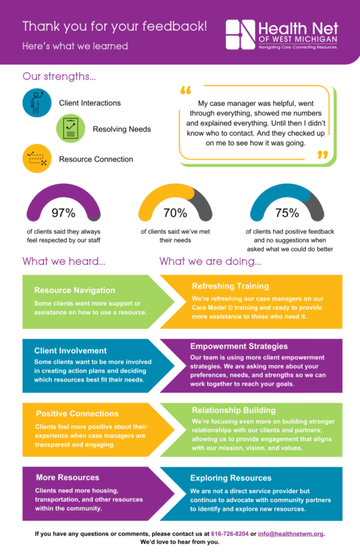 In 2025, we continued gathering feedback while implementing improvements based on what we heard. Our team spoke to 255 clients about their experiences working with Health Net of West Michigan. Their insights highlight both the strengths and opportunities for growth.